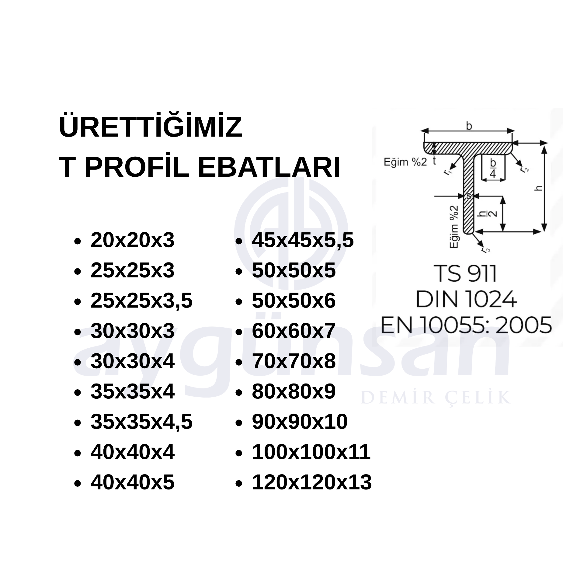 20X20X3 mm - 120x120x13 mm arası T profiller